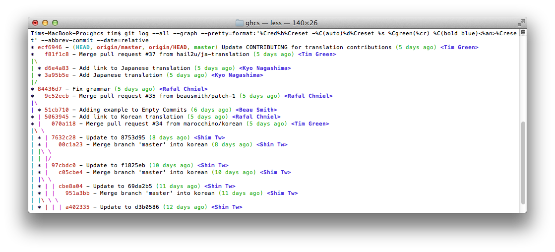 $ git log --all --graph --pretty=format:'%Cred%h%Creset -%C(auto)%d%Creset %s %Cgreen(%cr) %C(bold blue)<%an>%Creset' --abbrev-commit --date=relativeProduces: