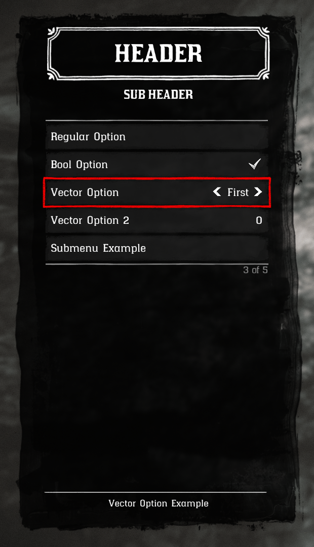 - These options contain multiple selections of choosable items. If you know what an std::vector is, then this option is basically that. Everytime this option is switched, your custom code will execute.