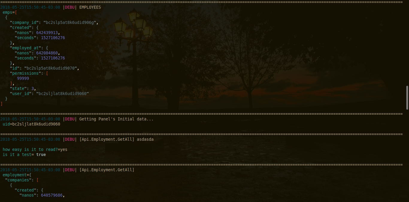 Horizontal is a pretty logging with focus on readability, based on the zerolog.ConsoleWriter but with some added features like json pretty printing and log line separator.