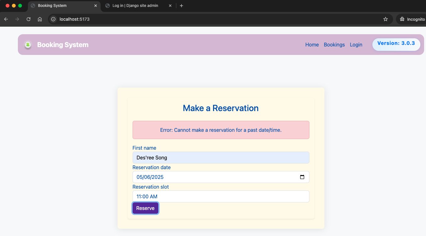 booking-sys | INFO 2025-06-15 00:04:36,379 views 10 140691344721600 GET by date (2025-06-15) Query set results: [{'id': 2, 'first_name': 'Halle Movie', 'reservation_date': datetime.date(2025, 6, 15), 'reservation_slot': datetime.time(12, 30)}]
