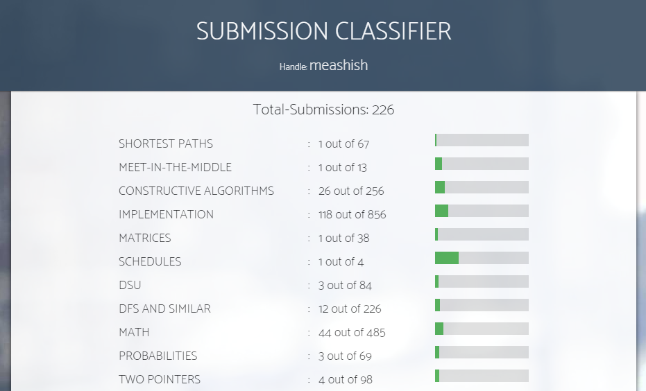 While solving problems on Online Judges people often lose track of their progress based on problem-categories. Searching and importing source codes is cumbersome and time-consuming. This small python script fetches their submission history along with their source codes and well categorizes them based on their tags. It also generates a HTML page that contain links to problems categorised according to their tags, along with links to local clone and actual Codeforces submissions made by the user.