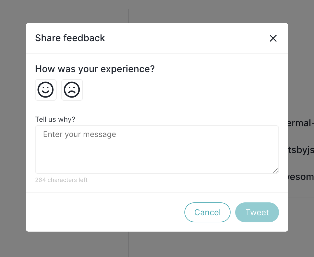 We're changing the concept of share feedback modal where users can share their feedback by selecting the emoji (😃or 🙁) and type the message in the textarea below it and then it can be published to twitter as a tweet.