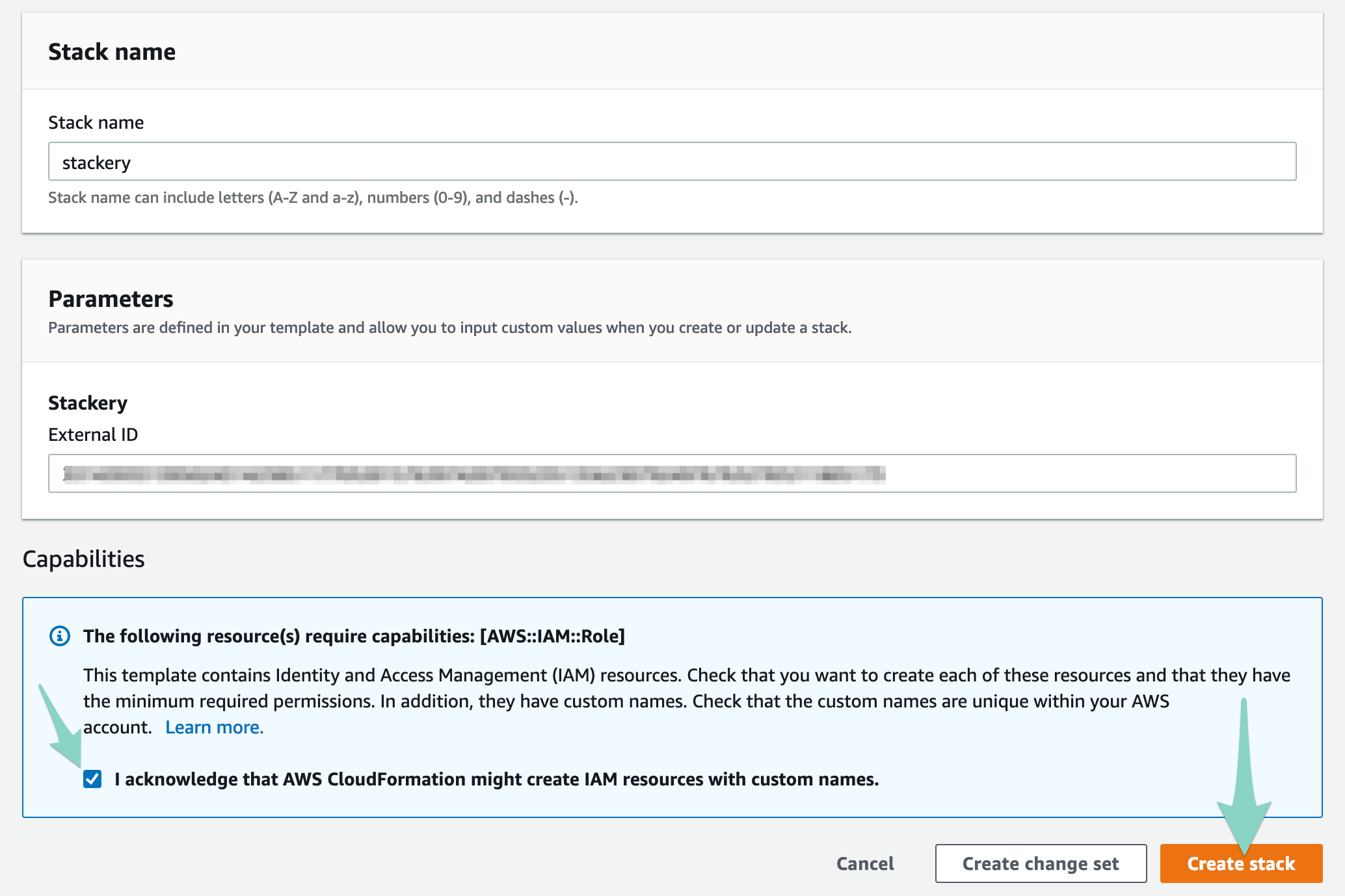 This will open up the CloudFormation console (you may be required to login first) with pre-populated parameters. In order to proceed, click the check mark saying you acknowledge the creation of IAM resources, then click the Create stack button. This process will take a few minutes as CloudFormation creates the appropriate roles.