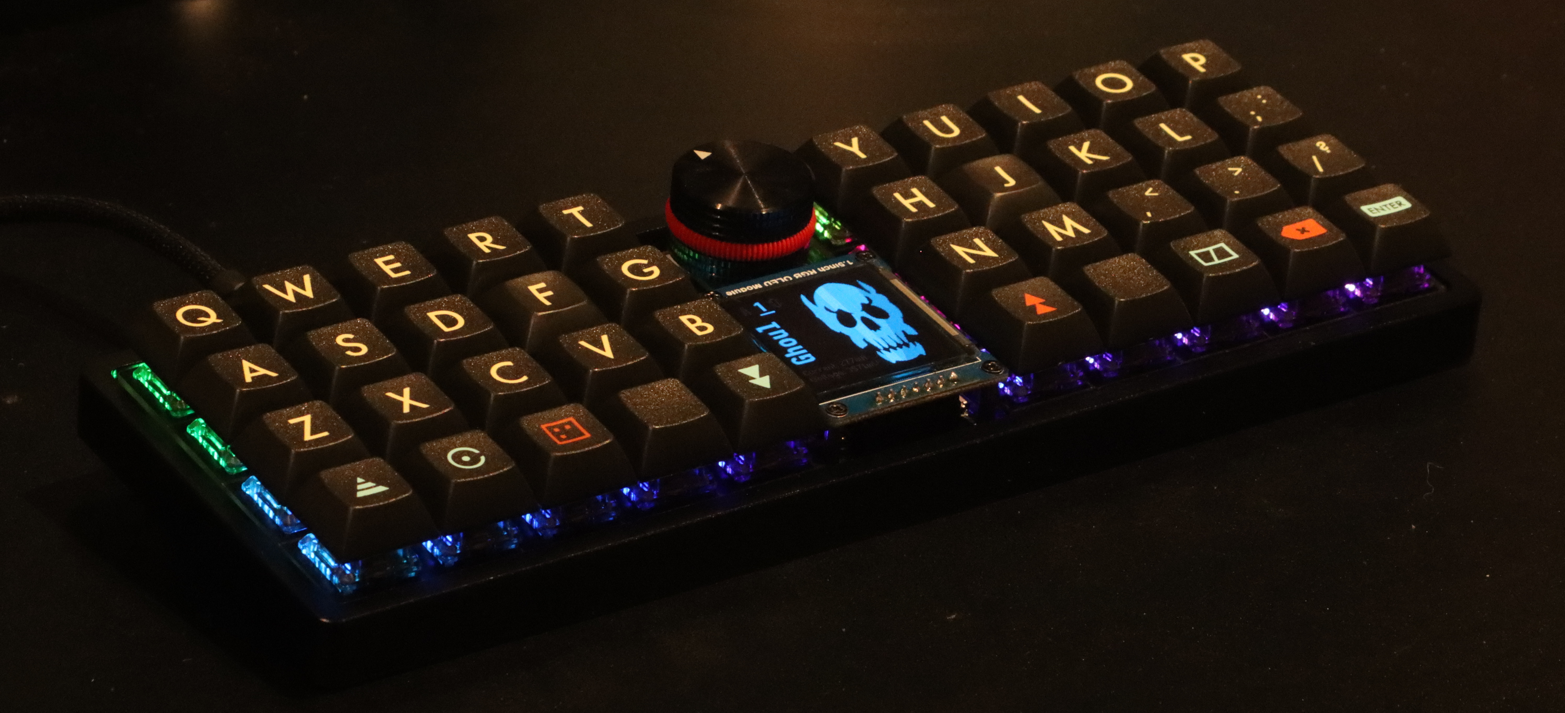 The Ghoul is a Planck-like development board for QMK, using SparkFun MicroMod for hot-swap MCU capability in a 2x4x5=40 layout with encoder and RGB OLED, per-key RGB.