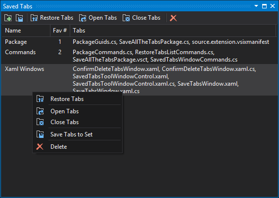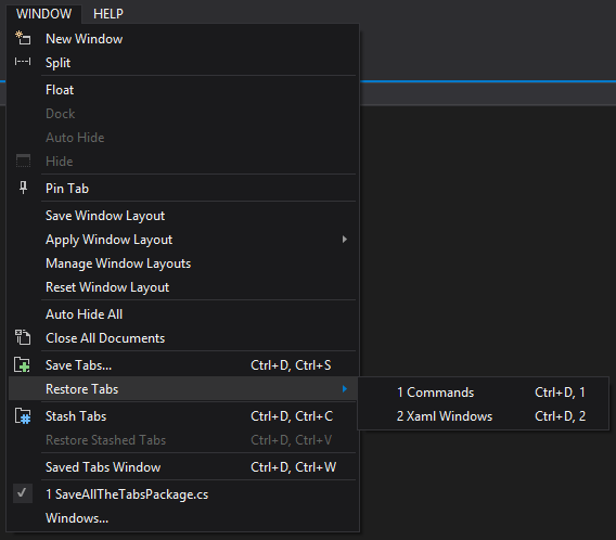 Save All the Tabs adds new commands to the Visual Studio Window menu and a Saved Tabs dockable window.